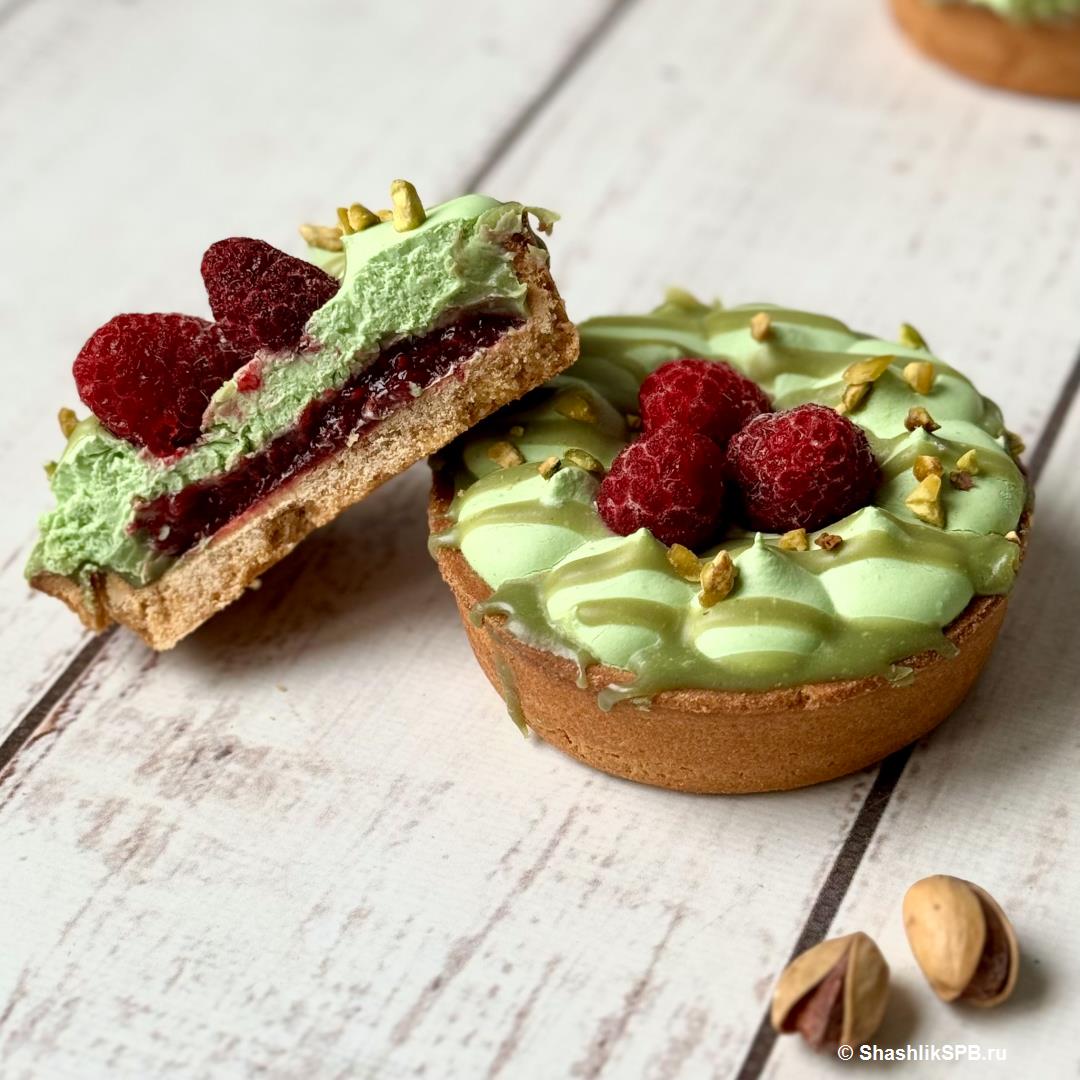 Фисташковый крем, малиновая прослойка в корзиночке из песочного теста. Сверху тарталетка украшена ягодами малины и дроблёной фисташкой.