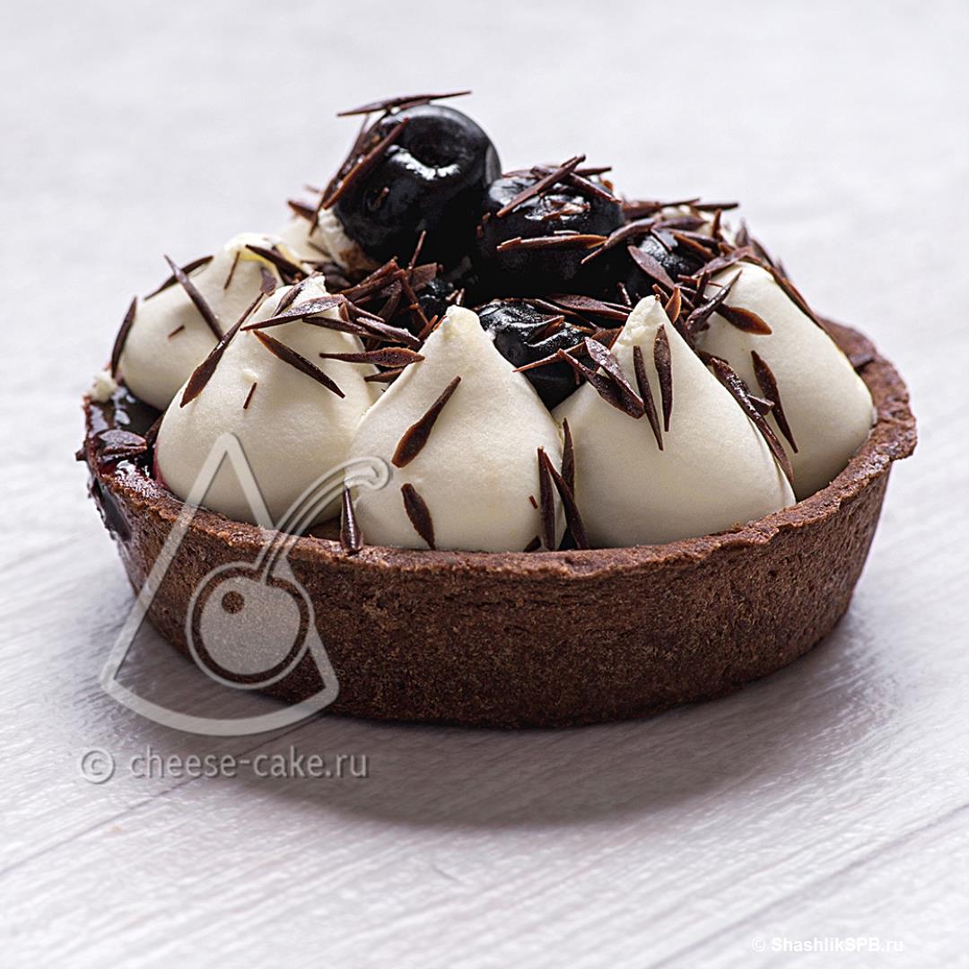 Шоколадная корзиночка с шоколадным муссом и начинкой из вишен, сверху нежный крем, украшена вишнями в сиропе.
